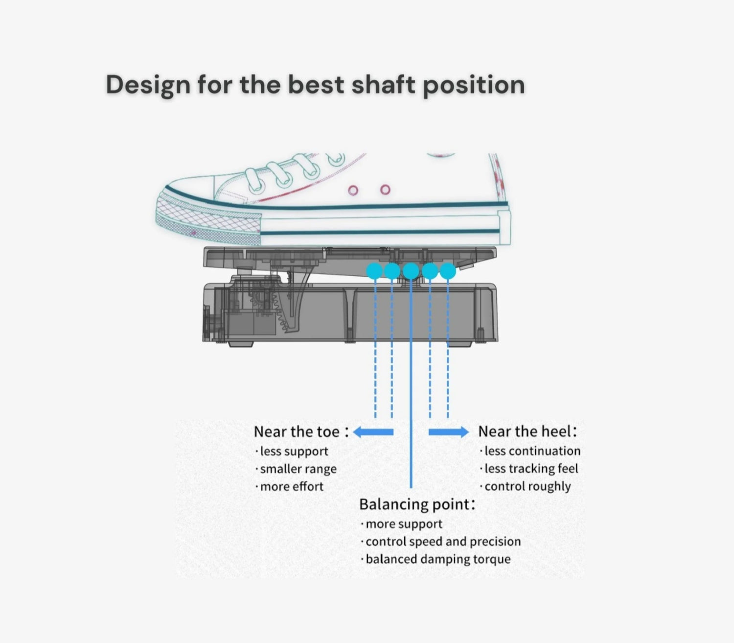 The position of the shaft is actually a very important factor in achieving suitable ergonomic characteristics or, simply put, a comfortable foot feel during prolonged use. We have conducted numerous design and experimental attempts, and have had musicians with different foot sizes try them out for an extended period of time. Through this process, we have found the optimal position and lever ratio.