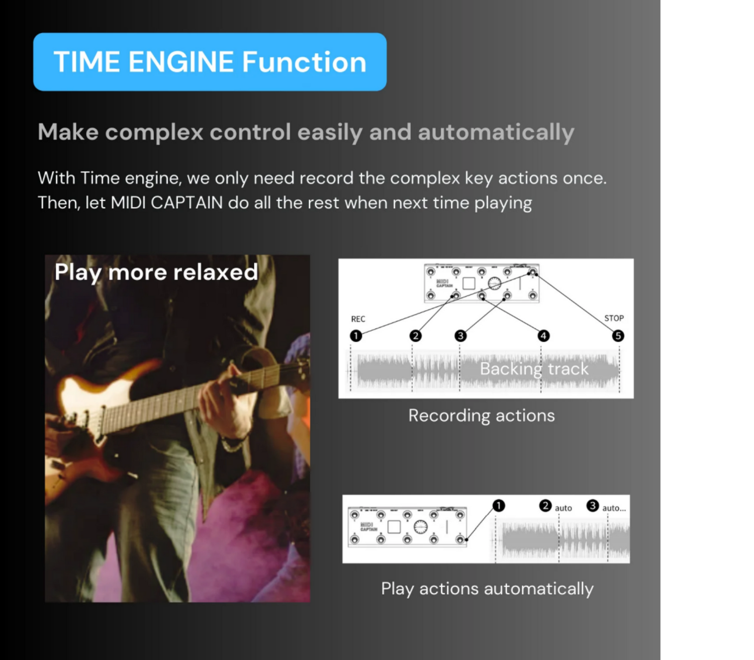 The unique time engine design creatively achieved automatic control of complex key actions in playing. Prepare all the needed effects presets in one bank,recording the actions for once -and MIDI CAPTAIN do all the next time. Enjoy your music gigs in a much easier and relaxed way. (The Time Engine feature may limit the usage of some regular functions, but it is highly effective and straightforward for simple tone-switching scenarios.)