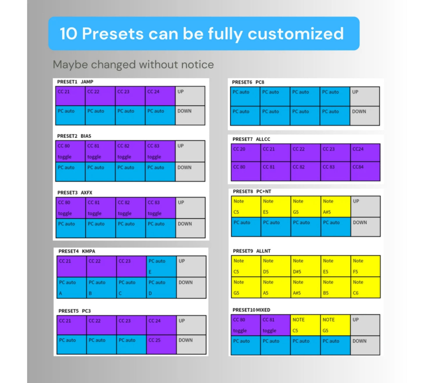 Based on common host device control requirements and application scenarios, We have designed 10 preset modes that are essentially ready to use. Additionally, you can easily adjust certain system function configurations and redefine the MIDI function of any footswitch based on the existing presets. You can then save these modifications as your unique presets. (We may continuously adjust and optimize the presets in different firmware versions, which may differ from the content displayed on this page.)